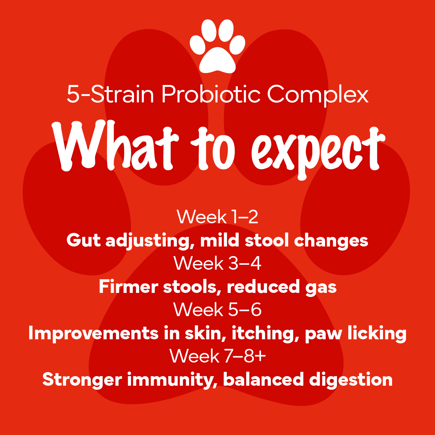 Our 5-Strain Probiotic Complex helps rebalance your dog's gut microbiome - supporting transformed digestion and a stronger immune system. We use a powerful blend of probiotics and prebiotics to restore balance in the gut, promoting healthy digestion, improved immunity, and overall well-being for your dog.